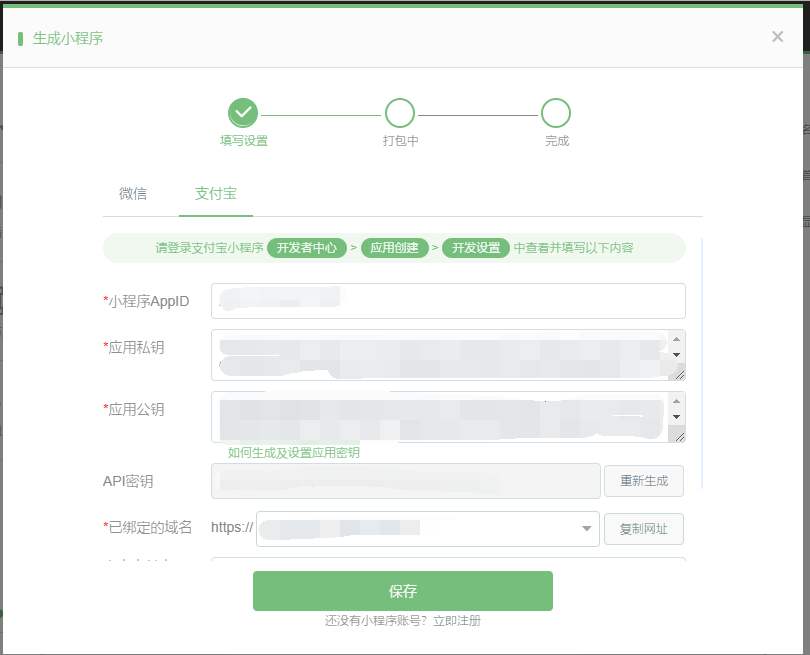 支付宝开发平台 对应的小程序管理中,点击“开发管理”-“开发设置”-“设置接口加密方式”根据流程获取公钥与私钥,并且将域名添加进去